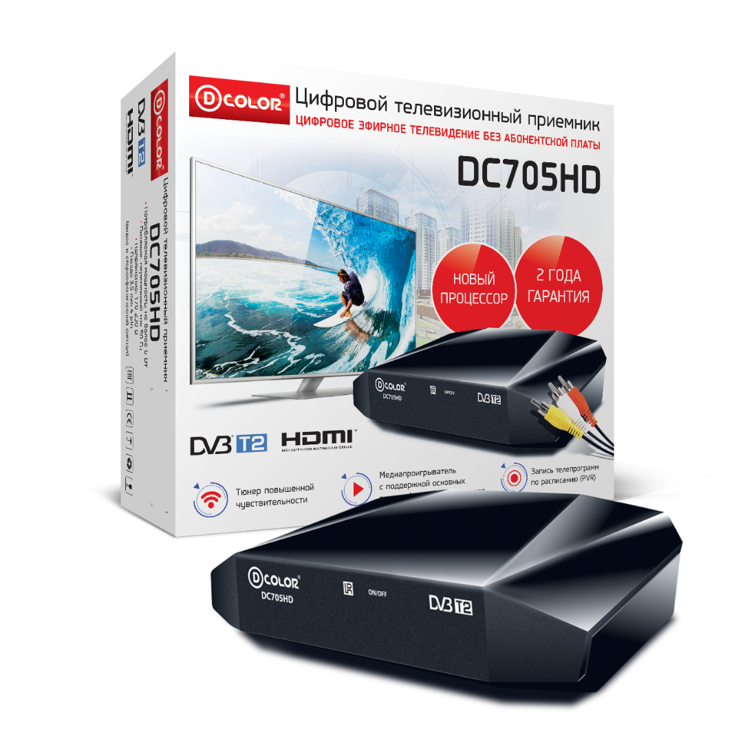 Приставка для цифрового ТВ D-Color DC 705 HD обеспечивает воспроизведение телепрограмм в цифровых форматах DVB-T и DVB-T2, поэтому вам будут доступны любимые телепередачи. Корпус устройства предусматривает наличие разъемов HDMI и USB, что подразумевает возможность подключения к приставке видео аппаратуры и цифровых, мобильных устройств, накопителей памяти.